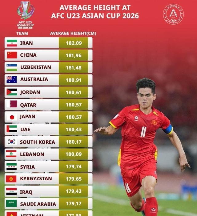 本届赛事,幸运彩app下载U23国足的平均身高为181.96cm,排行统共参赛队中第2,日本U23的平均身高为180.57cm,排行第7。U23国足的平均身高要比敌手跨越1.39cm。
