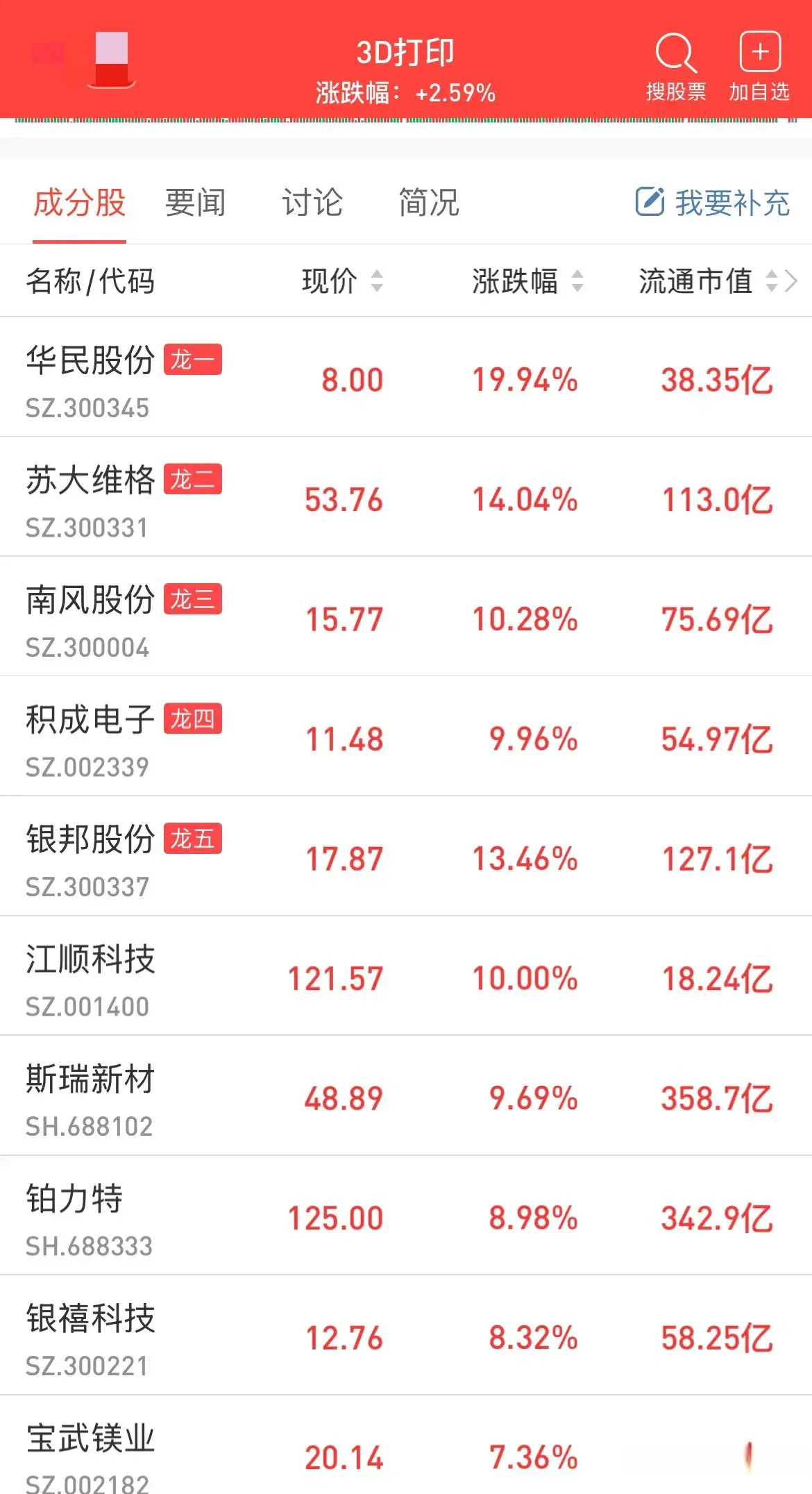 1月23日,3D打印见地发达活跃,死心当日14点40分支配,华民股份20CM涨停,苏大维格、银邦股份、南风股份等跟涨。