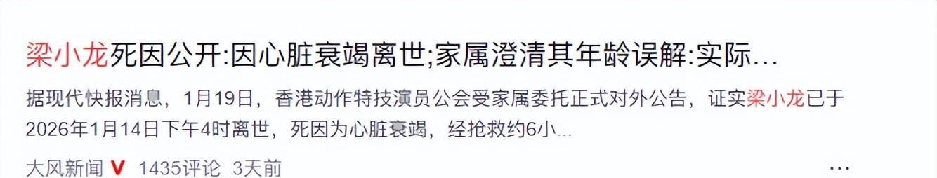 1月18日,梁小龙离世的音讯骤然传遍全网,让浩荡网友倍感惊险。但很少有东谈主知谈,这位巨星的生命其实早在1月14日下昼4点就已定格——香港动作特技演员公会受家属录用,后续发布的官方公告证实,梁小龙当日因病情危机被送往病院,经长达6小时的全力抢救后,最终因腹黑缺少宣告不治身一火。